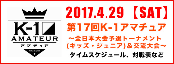 2017年5月16日(火)必着 ◇K-1キッズ・K-1ジュニア全日本トーナメント 2017年6月6日(火)必着 ◇K-1アマチュア各ワンマッチ 2017年6月6日(火)必着 ※締切日以降の申し込みは受付致しません。 申込方法