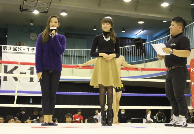 また大会を観戦に訪れていたK-1ガールズの西上まなみ、岡田ゆり子もリングから挨拶。それぞれ「木村選手のミットは音もスピードもすごかったです。見ていて圧倒されました」(西上)、「先日の会見でもゲーオ戦を控えている木村選手のバッドボーイぶりを見させてもらいました。1月18日のK-1をたくさんのファンの人たちにご覧になってもらいたいですし、私たちと一緒に選手を応援しましょう」(岡田)と語った。